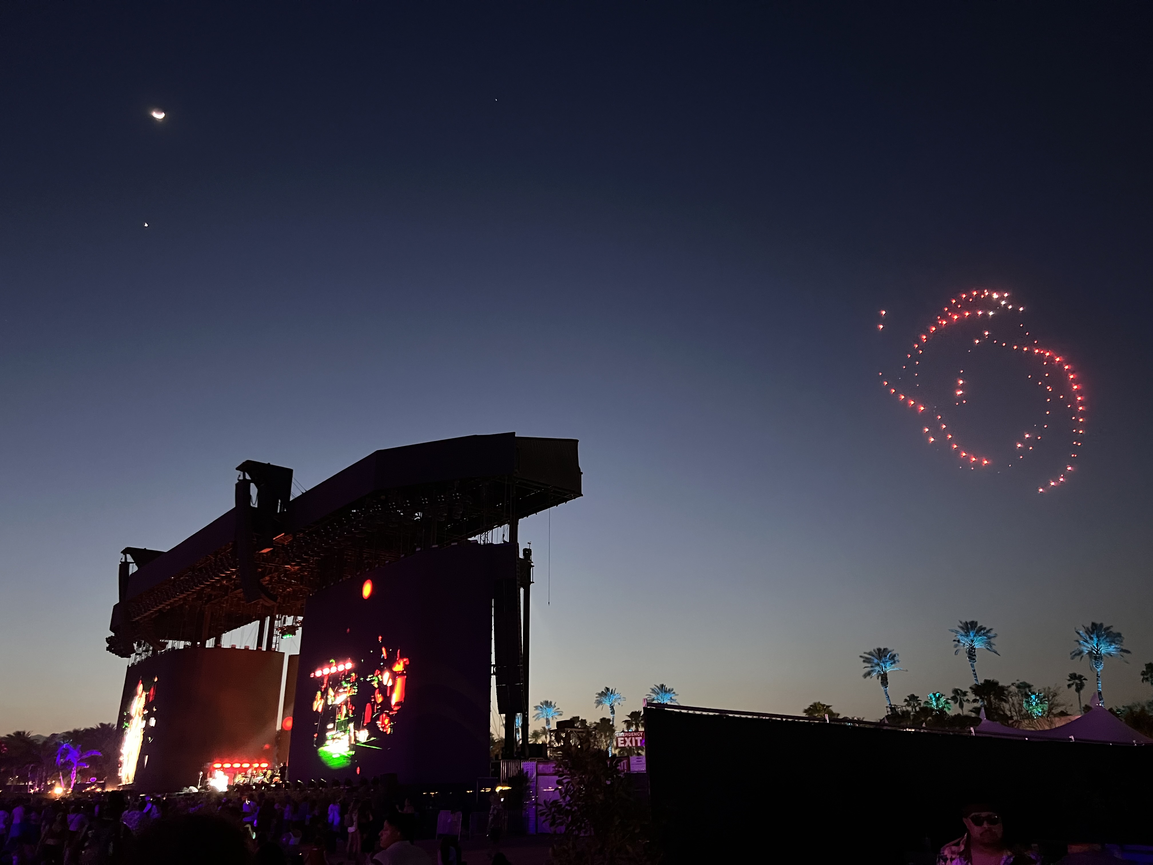 - Björk may not have been a headliner, but her set was brilliant. Armed with just her voice, and an orchestra, she was a reminder of how pure music can sound, at an event filled with prerecorded backing tracks. At one point, the dry heat and wind caused Björk to start coughing. She apologized to the audience, drank water, and continued. Her orchestral takes on her songs are certainly not to everyone’s tastes, and the audience slimmed down as festival goers sought out other things before blink-182 took the stage. Still, for us fans, it was a moment. While she performed, a drone show took place next to the stage. The entire moment was surreal.