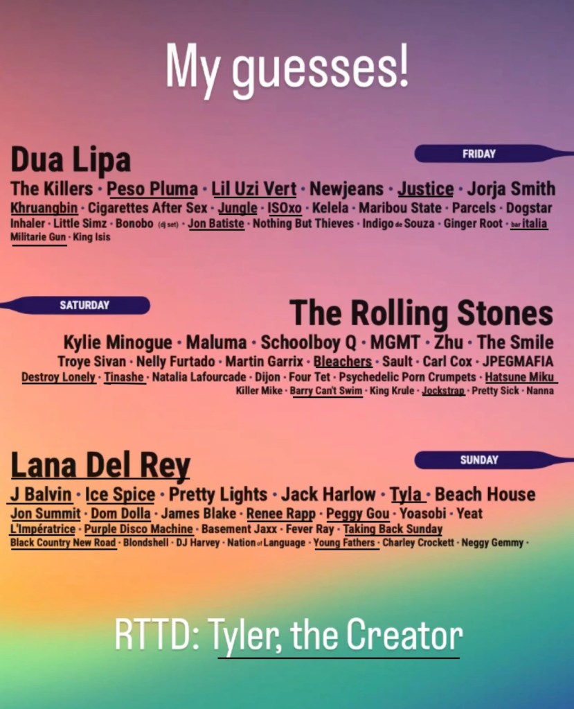 After endless anxiety on the Reddit Coachella sub, the lineup was finally released on Tuesday afternoon. There was a hint earlier in the day of No Doubt playing the festival. After all was said and speculated, the headliners remained the same: Lana Del Rey, Tyler, The Creator, and Doja Cat. I guessed thirty of the artists that ended up on the lineup (see my mock below), but I wish I’d been right about more of them. There’s plenty for me to enjoy at this festival, but it feels underwhelming compared to last year. I’ll be going through the artists on here leading into the festival, with more emphasis placed on the smaller/mid level artists. Here are some immediate things that stand out to me: